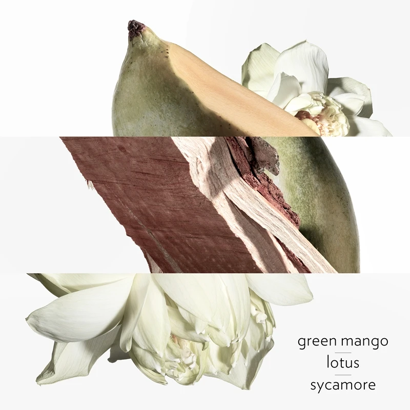 Un jardin de vie, généreux et pétillant, où les senteurs de mangue verte, de fleur de lotus et de jonc odorant se mêlent à l’encens et au bois de sycomore.